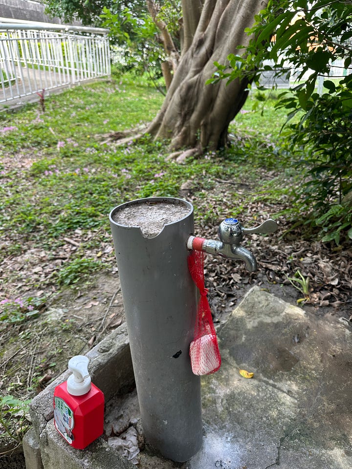A small temple, and a tiny piece of soap hanging inside a net bag near the water stand. Thoughtful.